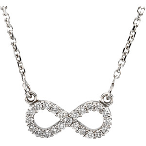 1/8 Carat TW Diamond Infinity Necklace. 16" Diamond Cut Cable Chain Included. Ref. 84405. 14K White Gold. Platinum Version: 68210.