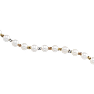 6 mm White Cultured Pearl & Tri-Color Quads. Cultured, freshwater pearls are spaced with quad beads in alternating 14K yellow, white, and rose gold.