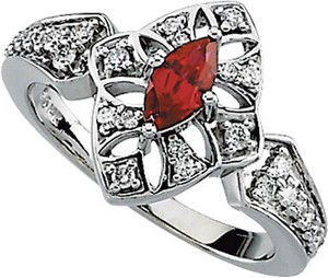 Set with:1ea Chatham® Lab Created Ruby - Marquise 07.00x03.50 MM Gem Faceted 14ea Genuine Diamond G-H Round SI1 01.30 MM (01.24 - 01.40) Full Cut 4ea Genuine Diamond G-H Round SI1 01.00 MM (01.00 - 01.15) Full Cut 8ea Genuine Diamond G-H Round SI1 01.50 MM (01.41 - 01.55) Full Cut
