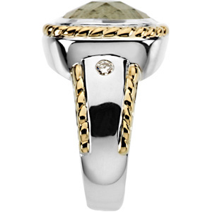 Genuine Checkerboard Green Quartz & Diamond Ring | Sterling Silver & 14KY Gold | 1/10 Carat TW | 12 x 12 mm. Set with 1ea 12.00x12.00 MM AA Checkerboard Genuine Quartz - Antique Square Checkerboard; AA Quality; Green & 2ea 02.40 MM (02.24 - 02.43) Full Cut I1 ROUND FULL CUT G-H GENUINE DIAMOND. Also available in Two-Tone 14K Yellow & 14K White Gold ref. SKU 66572-TT. Matching Pendant: 66573. Matching Earrings: 66574.