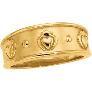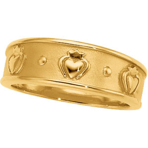 Claddagh Design Band. Ladies band is 8 mm wide. Gents band is 8.25 mm wide. Available in 14K Yellow or 14K White Gold.