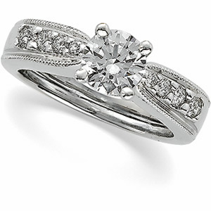 Diamond Bridal Enhancer | 1/4 Carat TW Side Diamonds. Available in 14K Yellow or 14K White Gold. Shown with 1 Carat Round 4-Prong Flex Fit Tiffany Solitaire SKU 150201, which is sold separately. Solitaire and center stone sold separately.