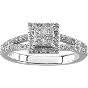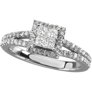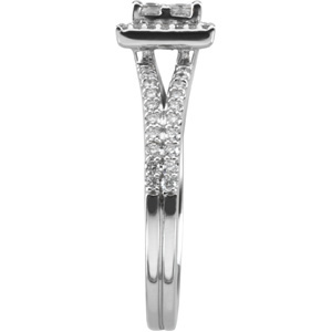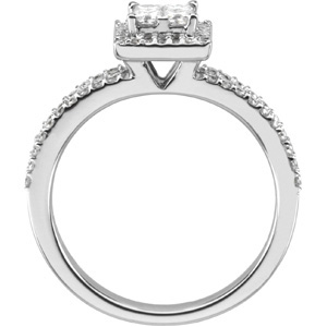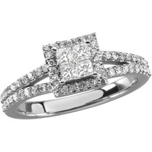 Diamond Engagement Ring | 1/2 Carat TW. 14K White Gold. Set with 2ea 0.060 Ct -- 2.00 MM, SI G-I Princess Diamond, 2ea 0.065 Ct -- 2.1 MM, SI G-I Princess Diamond, 24ea 0.004 Ct -- 0.9 MM, SI G-I Round Diamond & 40ea 0.006 Ct -- 1.1 MM, SI G-I Round Diamond.