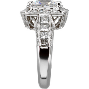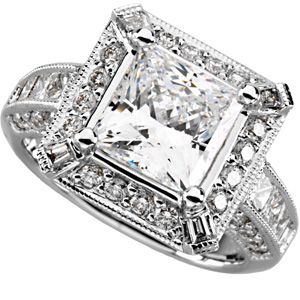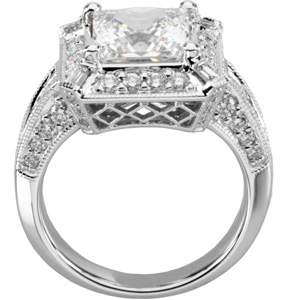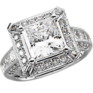 Diamond Engagement Ring | 1 1/3 Carat TW. Shown with a 9mm x 9mm Princess ( 3 Carat) diamond sold separately. 14K White Gold. Set with 2ea 0.065 Ct -- 2.1 MM, SI G-I Princess Diamond, 2ea 0.080 Ct -- 2.3 MM, SI G-I Princess Diamond, 4ea 0.008 Ct -- 1.2 MM, SI G-I Round Diamond, 4ea 0.011 Ct -- 1.35 MM, SI G-I Round Diamond, 4ea 0.017 Ct -- 1.55 MM, SI G-I Round Diamond, 4ea 0.020 Ct -- 2.0 MM, SI G-I Tapered Baguette Diamond, 4ea 0.026 Ct -- 1.8 MM, SI G-I Round Diamond, 4ea 0.070 Ct -- 2.2 MM, SI G-I Princess Diamond, 12ea 0.005 Ct -- 1.0 MM, SI G-I Round Diamond & 16ea 0.020 Ct -- 1.7 MM, SI G-I Round Diamond.