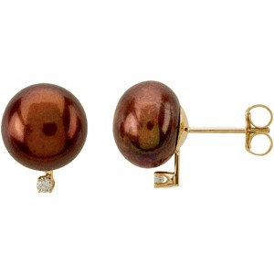 Freshwater Chocolate Pearl & Diamond Earrings. .04 Carat TW. 14K Yellow Gold. Set with 2ea 01.70 MM (01.56 - 01.80) Full Cut, I2 ROUND FULL CUT G-H GENUINE DIAMOND