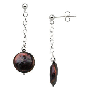 Freshwater Cultured Black Coin Pearl Station Earrings | 12 - 13 mm. Sterling Silver. Set with 2ea 12-13 MM, Gemstone Freshwater Pearls.