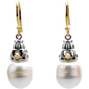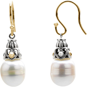 Freshwater Cultured Pearl Earrings. Sterling Silver & 14K Yellow Gold. Set with 2ea 11.00-12.00 MM Standard Undrilled, Cultured Pearl - Circle Undrilled Fg-freshwater; White.