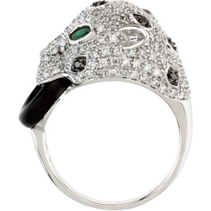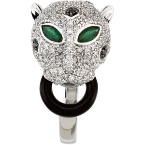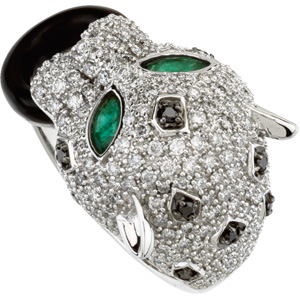 Set with:1ea 11x11 MM, Gemstone Onyx Fancy Cab2ea 0.140 Ct -- 5x2.5 MM, Marquise Gemstone Emerald Marquise Brilliant Facet8ea 0.009 Ct , Round Diamond Black19ea 0.004 Ct , I1 G-H Round Diamond154ea 0.006 Ct , I1 G-H Round Diamond