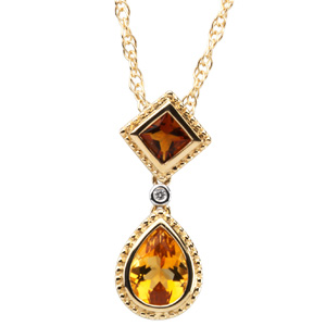 Genuine Madeira Citrine, Citrine & Diamond Pendant | .01 Carat TW. Matching Earrings: 66243. Set with 1ea 0.010 Ct GH I1 Round Diamond FULL CUT, 1ea 0.280 Ct -- 4x4 MM Princess Gemstone CITRINE & 1ea 1.000 Ct -- 8x6 MM Pear Gemstone CITRINE.