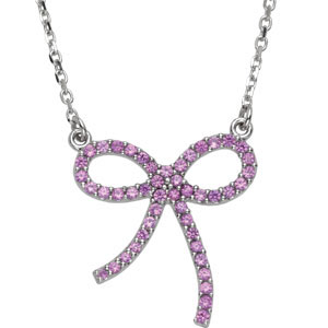 Genuine Pink Sapphire Bow Necklace. 14K White Gold. Ref. 84158. 16-inch cable cut diamond chain CH123 included. Set with 47ea 01.00 MM AAA Diamond Cut, Genuine Pink Sapphire - Round Diamond Cut; AAA Quality.