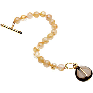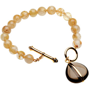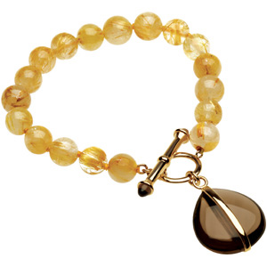 Genuine Rutilated Quartz Beads & Smoky Quartz Charm Bracelet. 14K Yellow Gold. 7 1/4 inches long.
