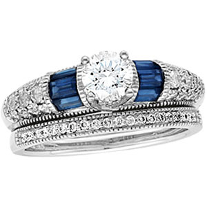 Pavé Diamond & Sapphire Semi-Set 3/8 Carat TW Engagement Ring with 1/10 Carat Matching Band. 1/2 Carat diamond center sold separately.