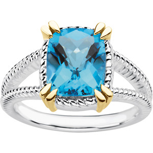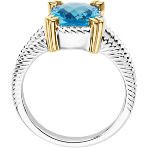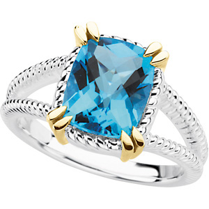 Genuine Swiss Blue Topaz Ring. Sterling Silver & 14K Yellow Gold. Ref. 71483. Set with 1ea 4.000 Ct -- 10x8 MM, Gemstone Swiss Blue Topaz Cushion Lozenge Checkerboard.