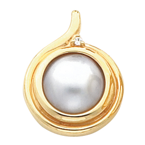 Pendant for 11.5 mm Mabe Pearl 3 pttw dia.; Design for 1 x 11.5 mm Mabe Pearl | .03 Carat TW. The price quoted is for the mounting and the side stone. The center Mabe pearl is sold separately.