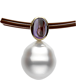 South Sea Cultured Circle Pearl & Genuine Amethyst Pendant | 7 x 5 mm / 11 mm Circle. Available in 14K Yellow Gold or 14K White Gold. Set with 1ea 07.00x05.00 MM AA Cab, Genuine Amethyst - Oval Cab; AA Quality & 1ea 11.00 MM Fine Undrilled, Cultured Pearl South Sea - Circle Undrilled Paspaley South Sea; Fine Quality; White. Chain/cord sold separately CH732. Ref. complete Necklace 69179.