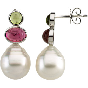 South Sea Cultured Circle Pearl & Multicolor Gemstone Earrings | 12 mm / 5 mm / 8 x 6 mm. Available in 14K Yellow Gold or 14K White Gold. Due to their unique nature, pearls will vary from what is pictured. Matching Pendant: 66292. Set with 2ea 05.00 MM AA Cab, Genuine Peridot - Round Cab; AA Quality, 2ea 08.00x06.00 MM AA Cab, Genuine Tourmaline - Oval Cab; AA Quality; Pink & 2ea 12.00 MM Fine Undrilled, Cultured Pearl South Sea - Circle Undrilled Paspaley South Sea Pair; Fine Quality; White.