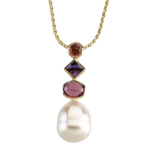 South Sea Cultured Circle Pearl & Multicolor Gemstone Pendant | 12 mm / 5 mm / 5 mm / 8 x 6 mm. Available in 14K Yellow Gold or 14K White Gold. Chain sold separately. Due to their unique nature, pearls will vary from what is pictured. Set with 1ea 05.00 MM AA Cab, Genuine Amethyst - Square Cab; AA Quality, 1ea 05.00 MM AA Cab, Genuine Tourmaline - Round Cab; AA Quality; Pink, 1ea 08.00x06.00 MM AA Cab, Genuine Garnet Rhodolite - Oval Cab; AA Quality; Reddish Purple & 1ea 12.00 MM Fine Undrilled, Cultured Pearl South Sea - Circle Undrilled Paspaley South Sea; Fine Quality; White.