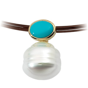 South Sea Cultured Circle Pearl & Genuine Turquoise Pendant | 7 x 5 mm / 11 mm Fine Circle. Available in 14K Yellow Gold or 14K White Gold. Chain/cord sold separately. Due to their unique nature, pearls will vary from what is pictured.