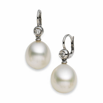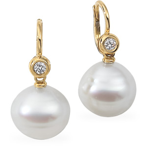 South Sea Cultured Pearl & Diamond Earrings | 14 mm Fine Circle. Available in 18K Yellow Gold or 18K White Gold. Set with 2ea 14.00 MM Fine Undrilled, Cultured Pearl South Sea - Circle Undrilled Paspaley South Sea Pair; Fine Quality; White.