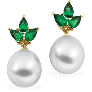 South Sea Cultured Pearl & Genuine Emerald Earrings | 10 mm Drop. 18K Yellow Gold. Set with 2ea 10.00 MM Fine Undrilled, Cultured Pearl South Sea - Drop Undrilled Paspaley South Sea Pair; Fine Quality; White & 6ea 05.00x03.00 MM AA Faceted, Genuine Emerald - Pear Shape Faceted; AA Quality.