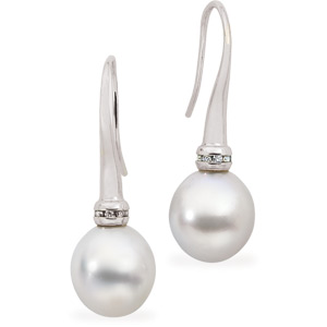 South Sea Cultured Pearl & Diamond Earrings | 12 mm Fine | 1/6 Carat TW. 18K Palladium White. Set with 2ea 12.00 MM Fine Undrilled, Cultured Pearl South Sea - Drop Undrilled Paspaley South Sea Pair; Fine Quality; White & 16ea 01.30 MM (01.24 - 01.40) Full Cut, VS ROUND FULL CUT G-H GENUINE DIAMOND.