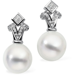 South Sea Cultured Pearl & Diamond Earrings | 12 mm Fine | 1/2 Carat TW. 18K Palladium White. Set with 2ea 03.00 MM (2.88 - 3.18) Princess, VS SQUARE PRINCESS G-H GENUINE DIAMOND, 2ea 12.00 MM Fine Undrilled, Cultured Pearl South Sea - Oval Undrilled Paspaley South Sea Pair; Fine Quality; White & 22ea 01.00 MM (01.00 - 01.15) Full Cut, VS ROUND FULL CUT G-H GENUINE DIAMOND.