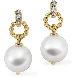 South Sea Cultured Pearl & Diamond Earrings | 12 mm Near Round | .06 Carat TW. Available in 18K Yellow Gold or 18K Palladium White Gold. Matching Pendant #64340. Set with 2ea 12.00 MM Fine Undrilled, Cultured Pearl South Sea - Near Round Undrilled Paspaley South Sea Pair; Fine Quality; White & 12ea 01.00 MM (01.00 - 01.15) Full Cut, VS ROUND FULL CUT G-H GENUINE DIAMOND.