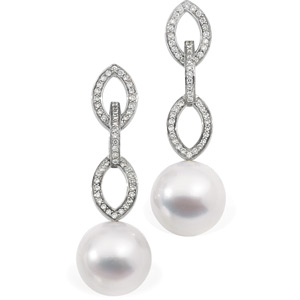 South Sea Cultured Pearl & Diamond Earrings | 12 mm Round / 1/2 Carat TW. 18K Palladium White. Matching Necklace #64232. Set with 2ea 12.00 MM Fine Undrilled, Cultured Pearl South Sea - Round Undrilled Paspaley South Sea Pair; Fine Quality; White & 100ea 01.00 MM (01.00 - 01.15) Full Cut, VS ROUND FULL CUT G-H GENUINE DIAMOND.