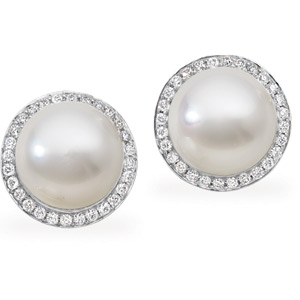 South Sea Cultured Pearl & Diamond Earrings | 13 mm Button-Full | 7/8 Carat TW. 18K Palladium White. Set with 2ea 13.00 MM Fine Undrilled, Cultured Pearl South Sea - Button-full Undrilled Paspaley South Sea Pair; Fine Quality; White & 56ea 01.50 MM (01.41 - 01.55) Full Cut, VS ROUND FULL CUT G-H GENUINE DIAMOND.