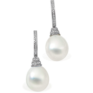 South Sea Cultured Pearl & Diamond Earrings | 13 mm Drop Fine | 3/8 Carat TW. 18K Palladium White. Set with 2ea 12.00 MM Fine Undrilled, Cultured Pearl South Sea - Drop Undrilled Paspaley South Sea Pair; Fine Quality; White, 2ea 13.00 MM Fine Undrilled, Cultured Pearl South Sea - Drop Undrilled Paspaley South Sea Pair; Fine Quality; White & 76ea 01.00 MM (01.00 - 01.15) Full Cut, VS ROUND FULL CUT G-H GENUINE DIAMOND.