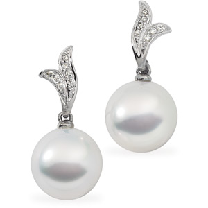 South Sea Cultured Pearl & Diamond Earrings | 13 mm Fine | 1/10 Carat TW. Available in 18K Yellow Gold or 18K Palladium White Gold. Set with 2ea 13.00 MM Fine Undrilled, Cultured Pearl South Sea - Near Round Undrilled Paspaley South Sea Pair; Fine Quality; White, 6ea 01.30 MM (01.24 - 01.40) Full Cut, VS ROUND FULL CUT G-H GENUINE DIAMOND & 8ea 01.00 MM (01.00 - 01.15) Full Cut, VS ROUND FULL CUT G-H GENUINE DIAMOND.