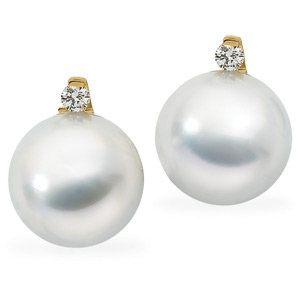 South Sea Cultured Pearl & Diamond Earrings | 13 mm Fine | 1/5 Carat TW. 18K Yellow Gold. Set with 2ea 03.00 MM (02.81 - 03.10) Full Cut, VS ROUND FULL CUT G-H GENUINE DIAMOND & 2ea 13.00 MM Fine Undrilled, Cultured Pearl South Sea - Near Round Undrilled Paspaley South Sea Pair; Fine Quality; White.