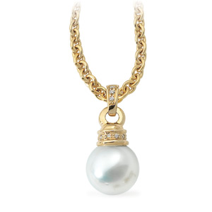 South Sea Cultured Pearl & Diamond Pendant | 11 mm Fine Near Round | .07 Carat TW. Available in 18K Yellow Gold or 18K Palladium White Gold. Set with 1ea 11.00 MM Fine Undrilled, Cultured Pearl South Sea - Near Round Undrilled Paspaley South Sea; Fine Quality; White, 2ea 01.20 MM (01.16 - 01.23) Full Cut, VS ROUND FULL CUT G-H GENUINE DIAMOND, 11ea 01.00 MM (01.00 - 01.15) Full Cut, VS ROUND FULL CUT G-H GENUINE DIAMOND.