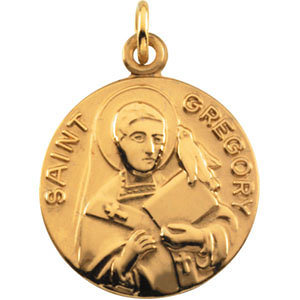 St. Gregory Medal | 18 mm. St. Gregory is the patron saint of teachers and England. Available in 14K Yellow Gold.