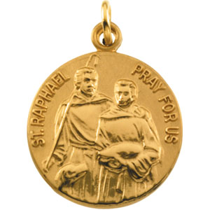 St. Raphael Medal | 18 mm. St. Raphael is the patron saint of the blind, nurses, physicians, travelers, lovers and happy meetings. Available in 14K Yellow Gold.