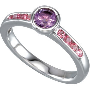 Set with:1ea 0.440 Ct -- 05.00x05.00 MM, Round Gemstone AMETHYST2ea 0.020 Ct -- 01.75x01.75 MM, Round Gemstone PINK TOURMALINE6ea 0.035 Ct -- 02.00x02.00 MM, Round Gemstone PINK TOURMALINEOR1ea 0.460 Ct -- 5x5 MM, Round Gemstone Pink Tourmaline2ea 0.020 Ct -- 1.75x1.75 MM, Round Gemstone Aquamarine6ea 0.030 Ct -- 2x2 MM, Round Gemstone Aquamarine