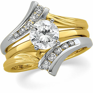 Two Tone Diamond Ring Guard | 1/4 Carat TW Side Diamonds. Shown with 1 Carat Round 4-Prong Solitaire SKU 150401, which is sold separately. Solitaire and center stone sold separately. Also available in all 14K White Gold.